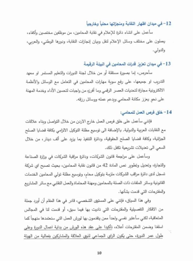 ويتعهد البرنامج في الدفاع عن مصالح النقابة، والمحافظة على تقاليدها وترسيخها، وضمان حرية المحامي في أداء رسالته والتأكيد على هيبته.