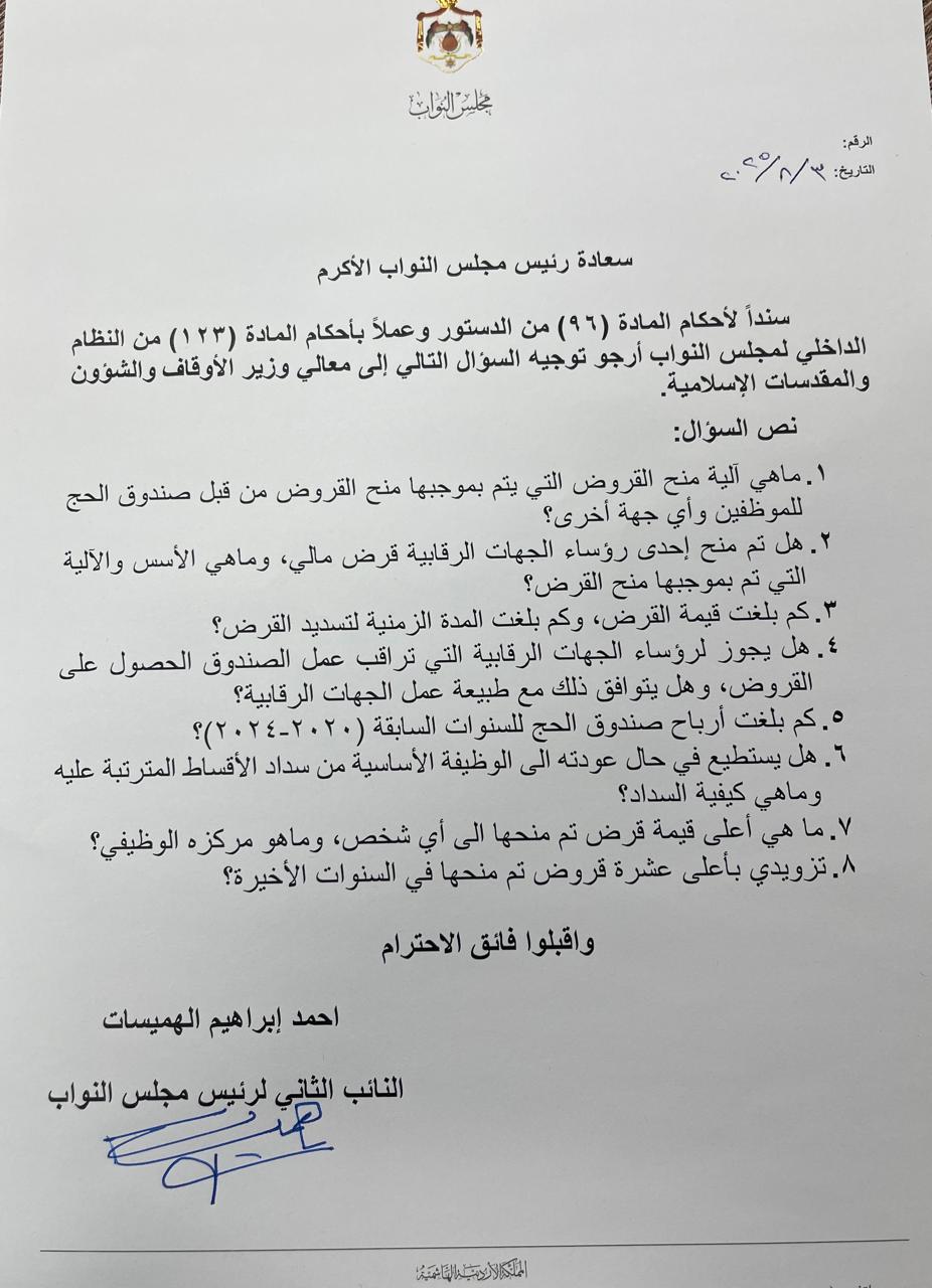 وجّه النائب أحمد إبراهيم الهميسات، النائب الثاني لرئيس مجلس النواب، سؤالاً نيابياً إلى وزير الأوقاف والشؤون والمقدسات الإسلامية، استناداً لأحكام المادة (96) من الدستور والمادة (123) من النظام الداخلي لمجلس النواب، بشأن آلية منح القروض التي يتم توجيهها من قبل صندوق الحج.